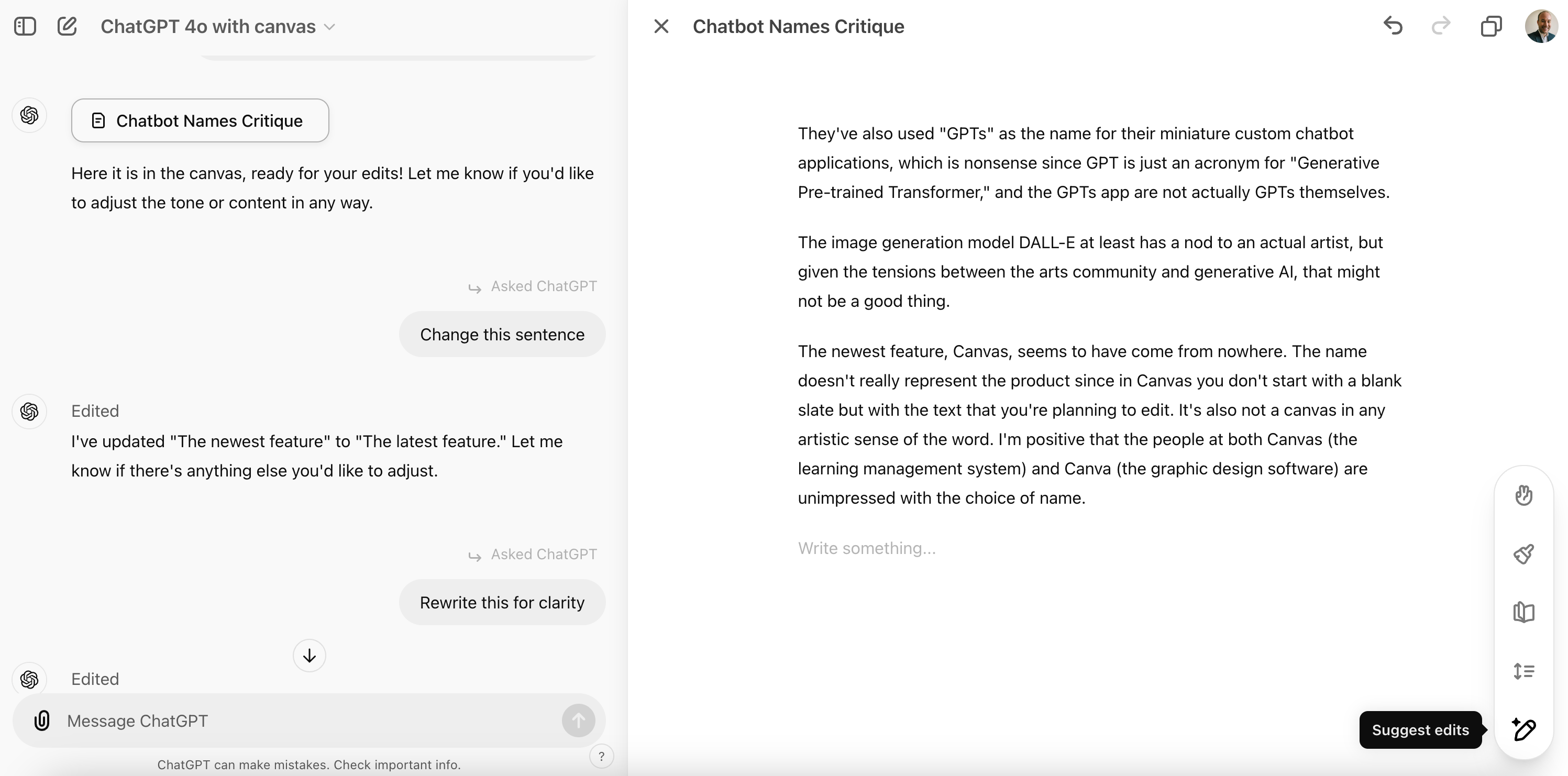 AI applications like ChatGPT, Claude, or Gemini don’t have a toolbar. They don’t have a handy list of features. Canvas addresses this by providing both an interactive toolbar that hovers on the right-hand side of the screen and more explicit prompts for what the model can be used for.